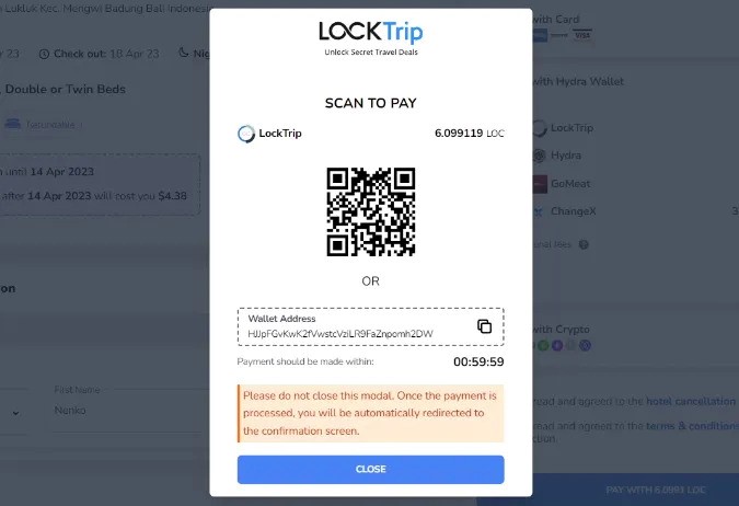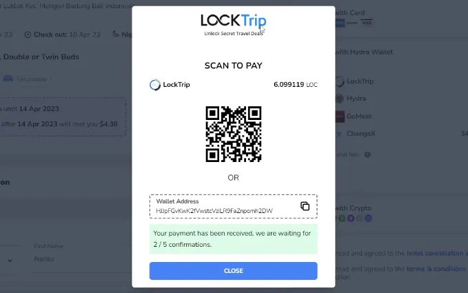 4. You will have a designated 1-hour timeframe to complete the payment process. This timeframe is indicated by a countdown timer. Once you initiate the payment, LockTrip's interface will display the progress of the transaction confirmations. Only 5 confirmations are required for the payment to be finalized, which usually takes about 2–3 minutes.